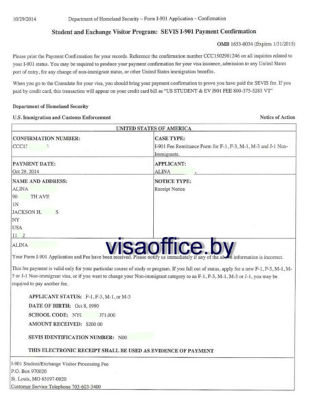 Образец об оплате SEVIS FEE при получении учебной визы F1