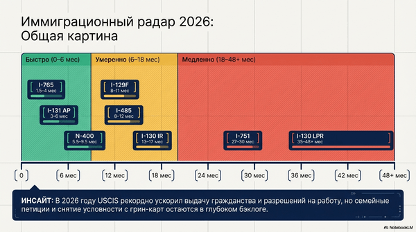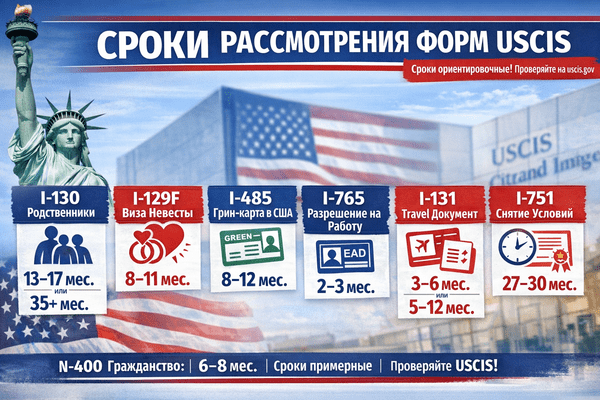 На середину марта 2026 года система выглядит так: быстрее всего идут N-400 и многие I-765, умеренно — I-485, а самыми вязкими остаются I-130 и I-751. Но главный практический вывод даже не в цифрах, а в методике их использования. Сроки USCIS нужно воспринимать как рабочий ориентир, который помогает планировать ожидание и понимать, когда дело действительно выходит за рамки нормы, — а не как обещание, что конкретный кейс завершится ровно в указанное время. Окончательная проверка всегда должна делаться по официальной странице USCIS Processing Times для конкретной формы, категории и офиса.