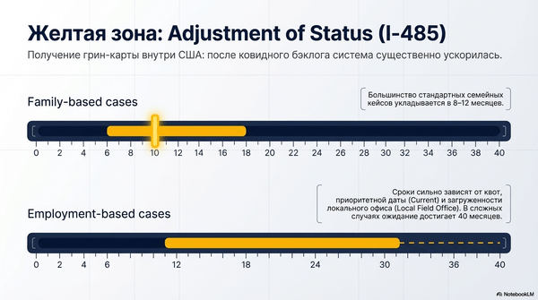 I-485 во многих семейных кейсах остаётся терпимым по срокам, хотя разброс между офисами очень большой.