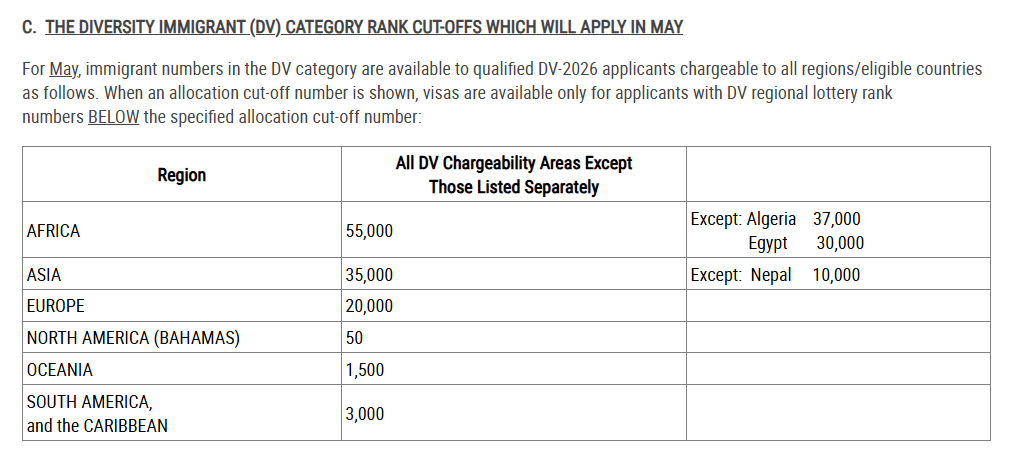 Для апреля 2026 года USCIS объявил, что для всех семейных предпочтительных категорий необходимо использовать таблицу Dates for Filing, а для всех рабочих предпочтительных категорий также необходимо использовать таблицу Dates for Filing из апрельского Visa Bulletin.